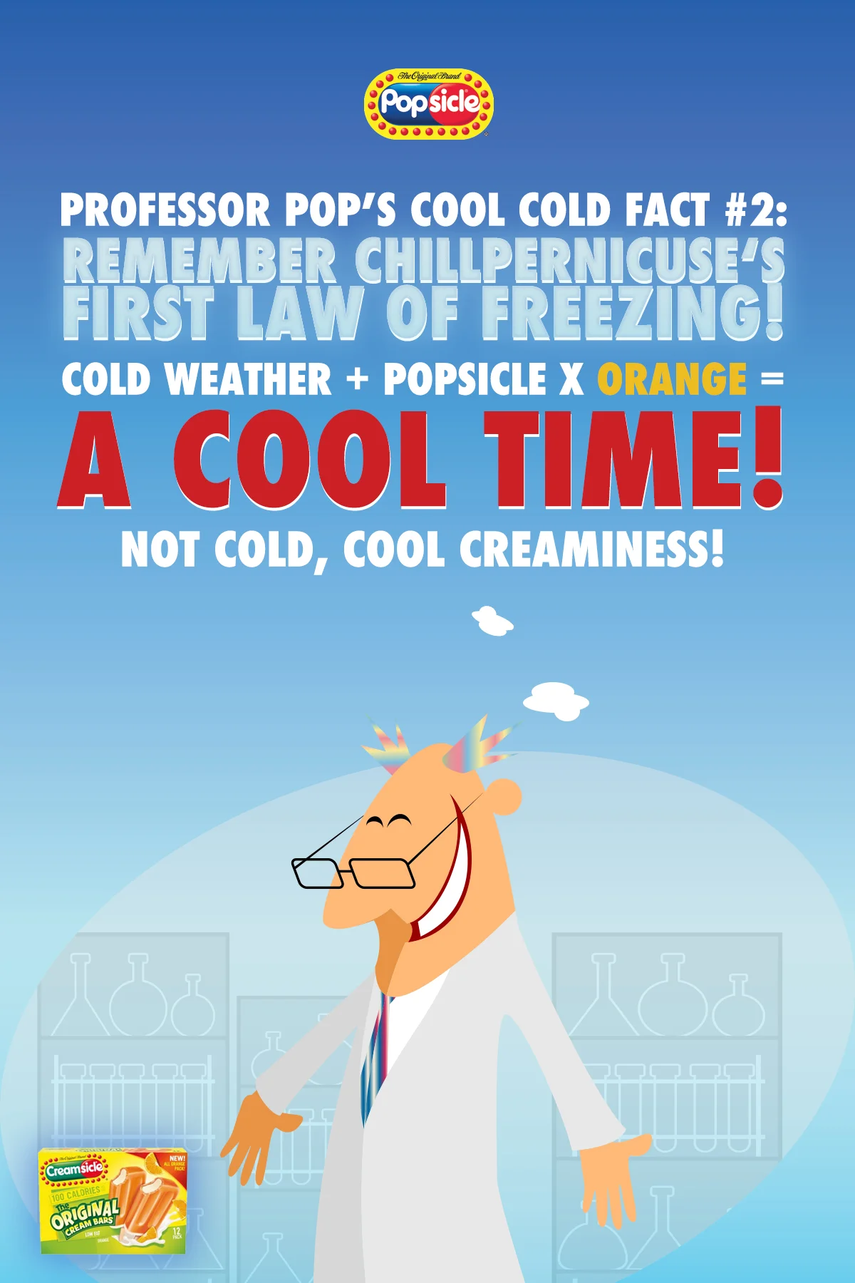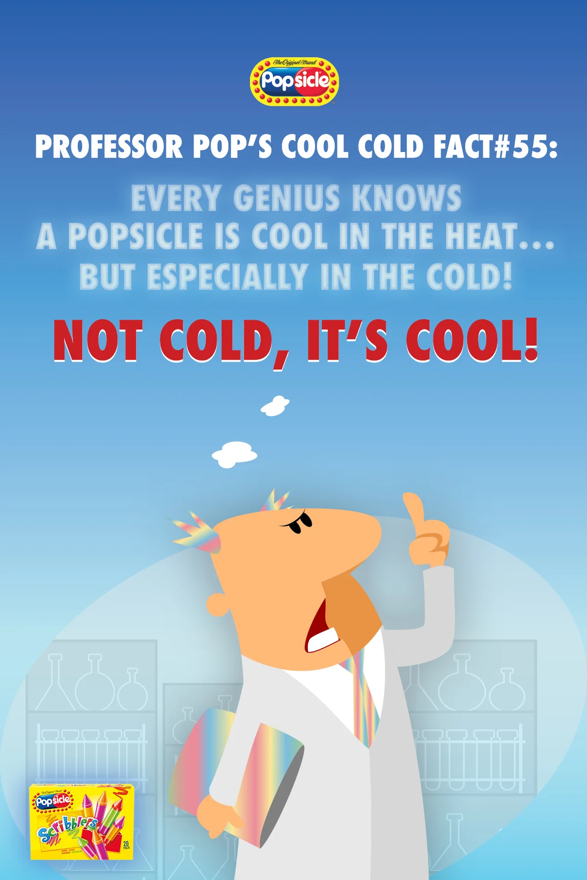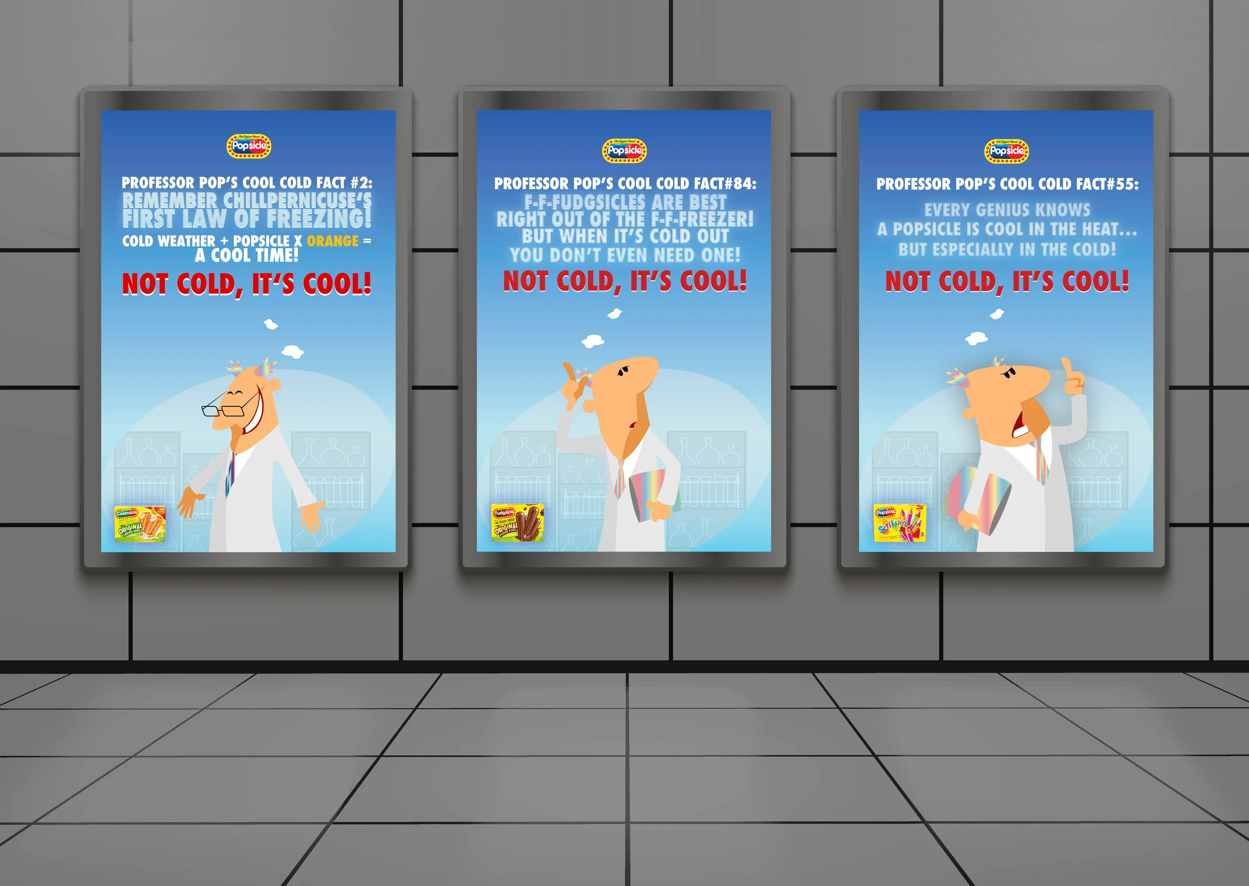 Professor Pop spearheads a seasonal rebranding of Popsicle® by making it fun and trendy to enjoy popsicles even when it's cold outside. His claim-to-fame catch phrase is "It's Not Cold, It's Cool!" From digital, to experiential, to television and merchandise, the campaign around Professor Pop leads to increased sales for popsicles during the winter.