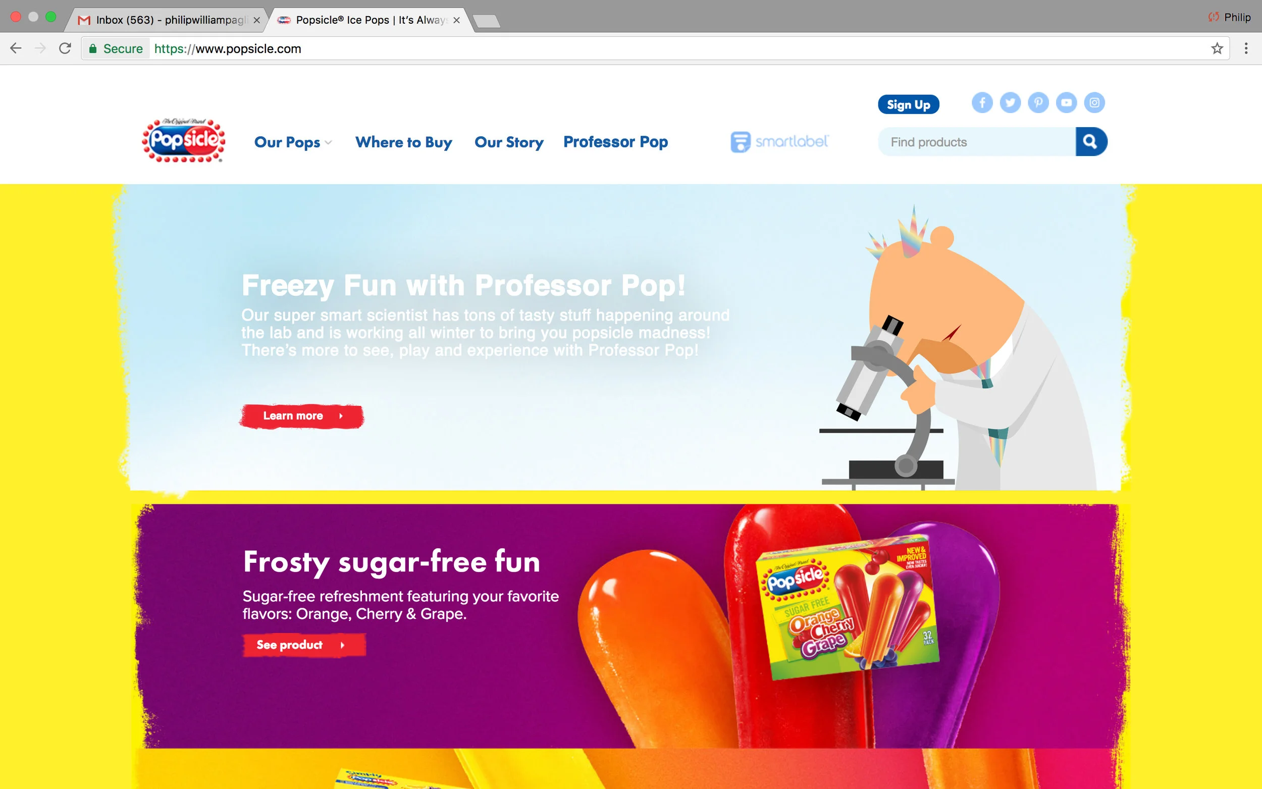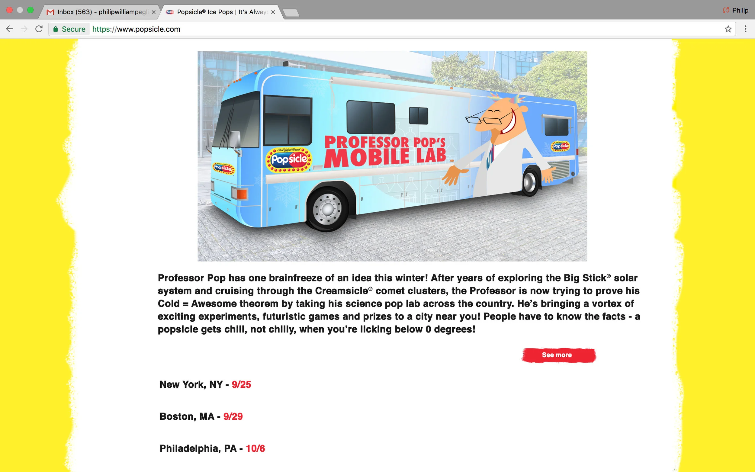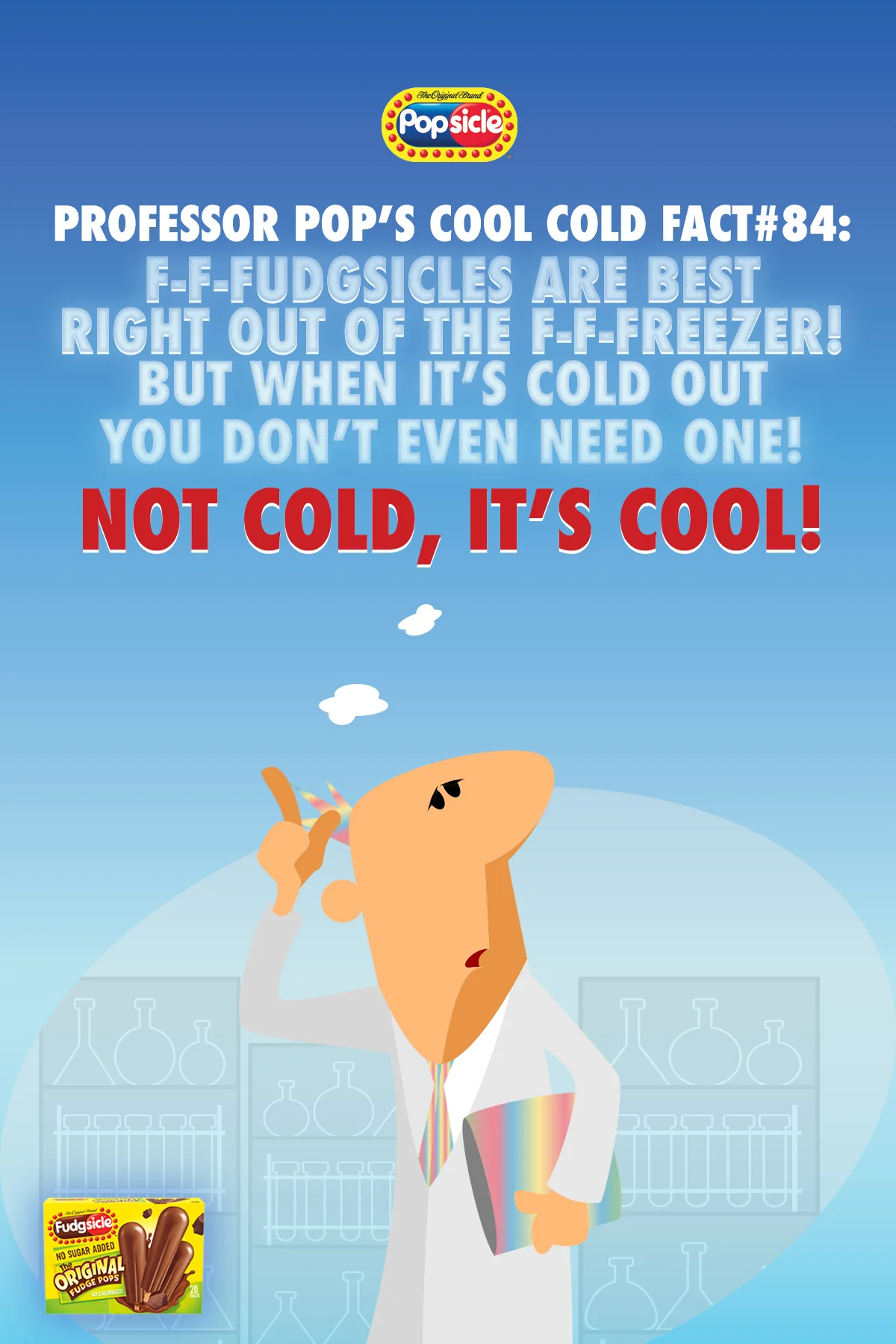 Professor Pop spearheads a seasonal rebranding of Popsicle® by making it fun and trendy to enjoy popsicles even when it's cold outside. His claim-to-fame catch phrase is "It's Not Cold, It's Cool!" From digital, to experiential, to television and merchandise, the campaign around Professor Pop leads to increased sales for popsicles during the winter.